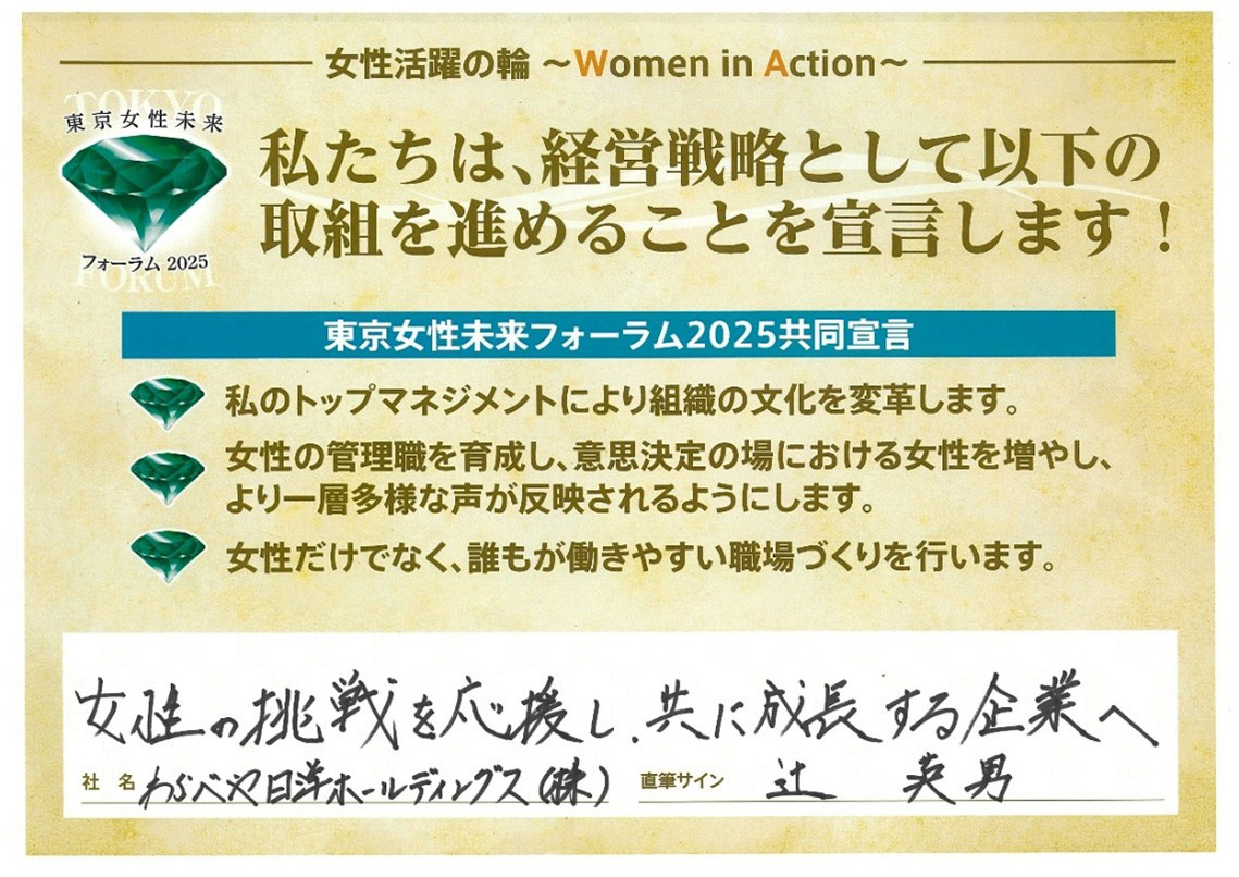 当社は、女性活躍・ダイバーシティ経営に向けた共同宣言に賛同し、東京都が推進する「東京女性リーダーズ応援ネットワーク」に参加いたしましたので、お知らせいたします。
